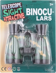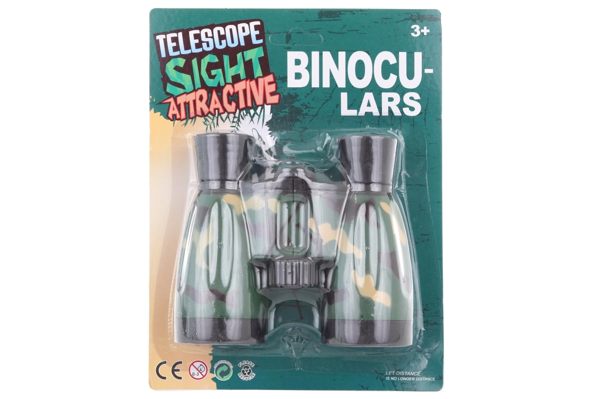 Kunststoff-Fernglas im Tarnmuster, ca. 13,5 × 12 × 5 cm groß. Verpackungsmaße ca. 17 × 22 × 5,5 cm. Alter 3+