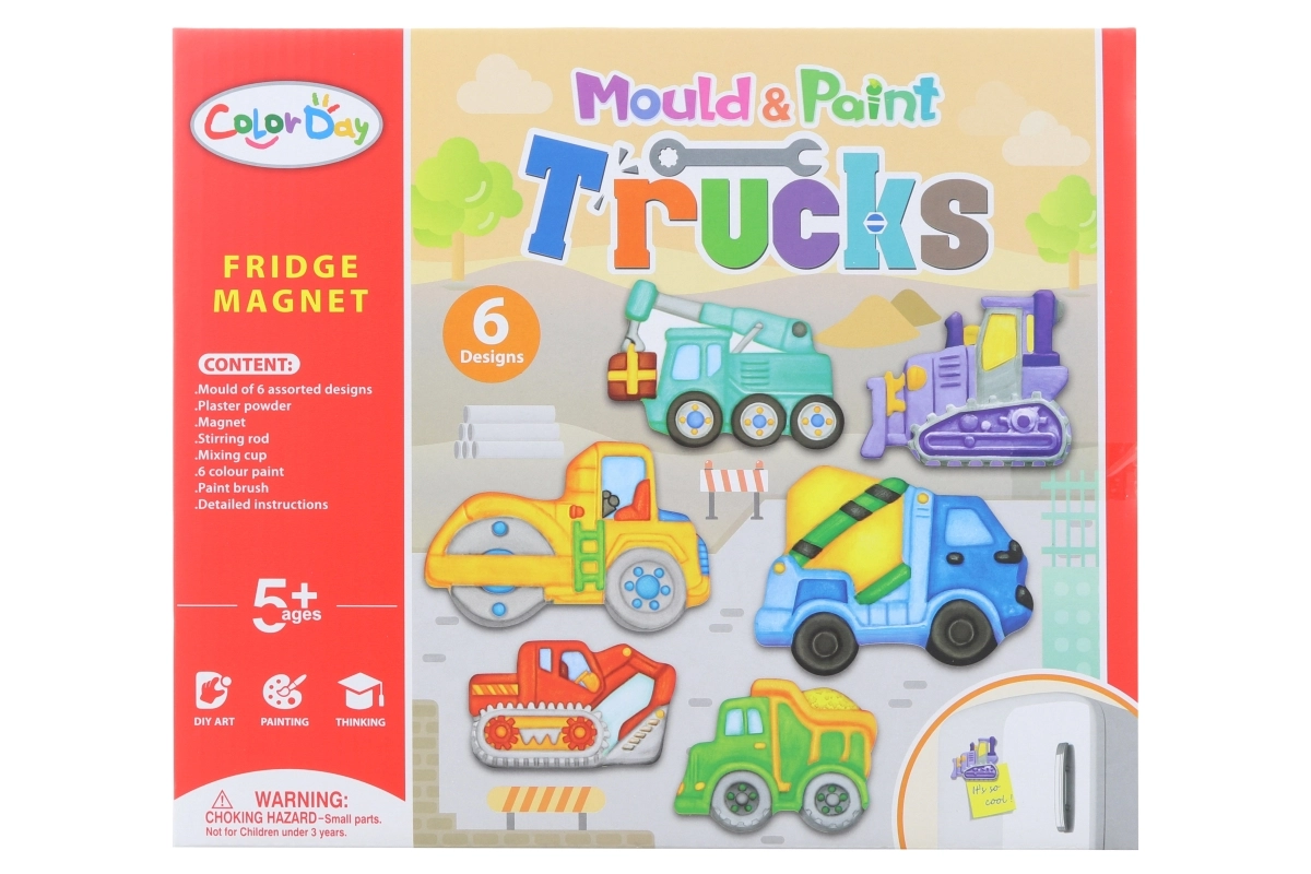 Verwandeln Sie Basteln in ein Abenteuer auf der Baustelle. Mit diesem Set gießen Kinder Gipsmagnete in eine Form mit 6 Motiven von Baufahrzeugen, bemalen sie mit den beiliegenden Farben und gestalten mithilfe der Magnete fröhliche Deko für den Kühlschrank oder die Magnettafel.