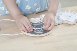 Glatte Holzteile mit sicheren Öffnungen und robusten Schnüren. Ideal für das tägliche Üben der Feinmotorik.