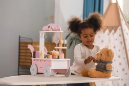 Der 3-in-1 Kinder-Holzstand POLARB von VIGA verwandelt jedes Zimmer in ein süßes Königreich. Dank der fahrbaren Ausführung, der kleinen Glocke und des bunten Sets aus hölzernen Leckereien trainieren Kinder Kreativität, Kommunikation und Rollenspiel als Verkäufer oder Konditor. Die zarte Pastellpalette und die sorgfältige Verarbeitung laden immer wieder zum Spielen ein.