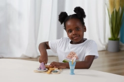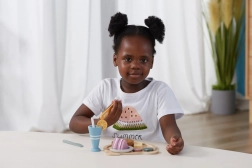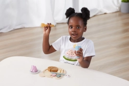 Bunte Essensstücke, Dessert und Getränk ermöglichen Kindern, wie in echt zu servieren und grundlegende Tischsitten zu üben.