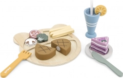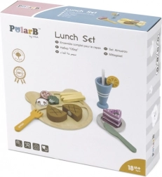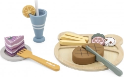 Das Holz-Mittagessenset POLARB von VIGA ist bereit, Leckereien stilvoll zu servieren. Auf dem Teller können Kinder Steak, Pommes, Gemüse und Dessert anrichten und alles mit einem Getränk mit Strohhalm „hinunterspülen“. Realistische Accessoires animieren zum Nachahmen der Erwachsenen und fördern Selbstständigkeit sowie Wortschatz.