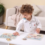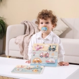 Holzsteckpuzzle mit Verkehrsmittelmotiv. Größe der Holzplatte ca. 22 × 22 cm. Verpackungsgröße ca. 22 × 22 × 2,5 cm. Alter 18 Monate+