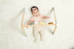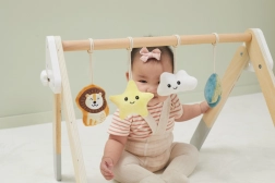 Die Hängespielzeuge rasseln, knistern und quietschen, wodurch Gehör, Sicht und Tastsinn gefördert und das Baby zum Strecken und Greifen motiviert wird.