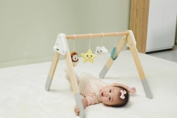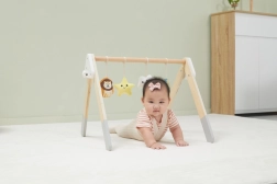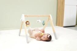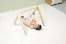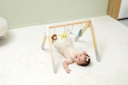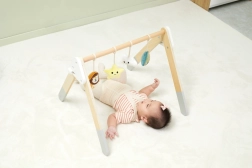 Dieser hochwertige Holz-Babyspielbogen ist bereits ab dem 1. Monat geeignet. Das natürliche Design und die angenehmen Farben passen in jedes Interieur. Die Hängespielzeuge fesseln das Baby mit Geräuschen und verschiedenen Texturen, die Sehen, Hören und Tasten stimulieren.