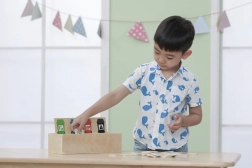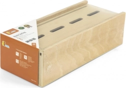 Das Spielzeug lehrt Kinder die richtige Mülltrennung mithilfe spielerischer Holzplättchen und farblich markierter Behälter.