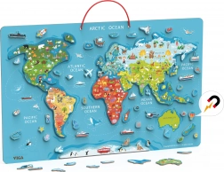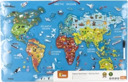 Die Karte besteht aus 106 magnetischen Teilen, die Länder, Verkehrsmittel und Tiere darstellen und das Erlernen der Geografie erleichtern.