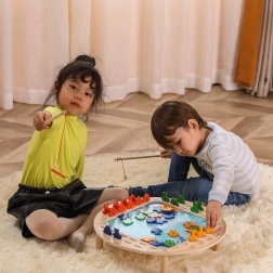 Ein Holztisch mit bunten Fischen und vier Angelruten fördert das wettbewerbsorientierte Spielen und die Entwicklung motorischer Fähigkeiten in der Gruppe.