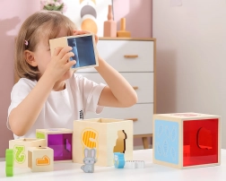 Die transparenten Plastikseiten der Blöcke bieten eine zusätzliche Dimension des Spiels, da sie das Licht reflektieren und es den Kindern ermöglichen, zu beobachten, wie sich das Bild der Welt um sie herum verändert. Dies eröffnet Raum für Kreativität und das Beobachten von Licht und Farben.