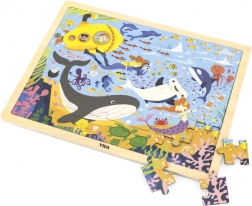 Mit dem Holzpuzzle Meeresleben entdecken Sie eine erstaunliche Vielfalt von Meerestieren wie Walen und Fischchen, alles inklusive einem gelben U-Boot.