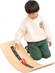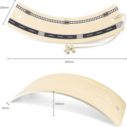 Dank der beiliegenden Schnur mit Holzgriffen können Kinder das Brett ziehen, darauf sitzen und sich bewegen. Drei selbstklebende Streifen verwandeln die Oberfläche in eine Straße für Spielzeugautos, sodass das Brett auch zum kreativen Spielelement wird – Rampe, Brücke, Rutsche oder Rennbahn. Das Brett wächst mit dem Kind ab dem Vorschulalter mit, und dank der hohen Tragkraft haben auch ältere Geschwister Freude daran.