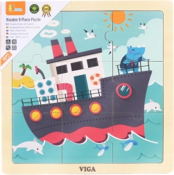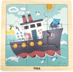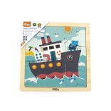 Dieses Holzpuzzle mit einem bunten Schiff und Meerestierchen enthält 9 thematische Teile, die in eingefräste Vertiefungen der Platte eingesetzt werden. Leuchtende Farben und einfache Formen fördern die Konzentration und motivieren Kinder zum wiederholten Puzzeln.