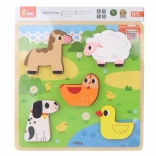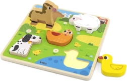 Dieses niedliche Holzpuzzle mit Bauernhof-Thema enthält 5 robuste Teile – Pferd, Schaf, Henne, Hund und Entchen. Kinder setzen die Tiere in die passenden Aussparungen der bunten Unterlage ein und trainieren so Formerkennung und visuelles Gedächtnis.