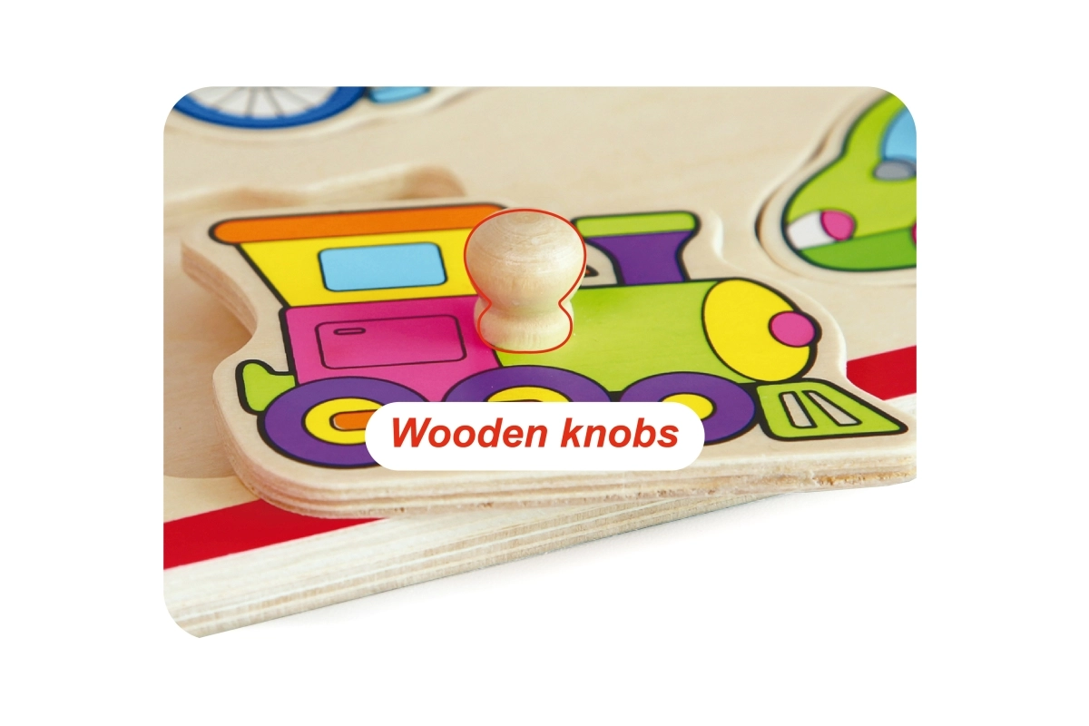 Jedes Teil hat einen Holzknopf, mit dem Kinder die Formen leicht anheben und passgenau einsetzen können – ideal zum Training der Feinmotorik.