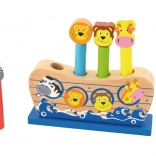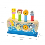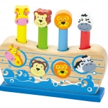 Drücken Sie den Kopf und sehen Sie zu, wie Giraffe, Äffchen, Löwe und Zebra fröhlich aus dem Schiff herausspringen. Ideales Spiel zum Verständnis des Prinzips Aktion–Reaktion.