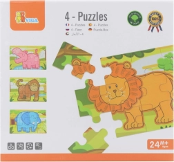 Dieses Set aus Holzpuzzles mit fröhlichen Dschungeltieren macht jedem Kind Spaß. Jedes Motiv hat klare Farben und einfache Formen, die das Puzzeln erleichtern und die kindliche Fantasie natürlich fördern. Aus den Teilen lassen sich sowohl vier einzelne Bilder als auch ein langes Panorama aller Tiere zusammensetzen.