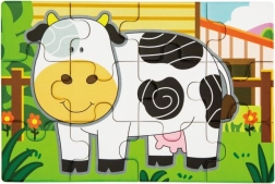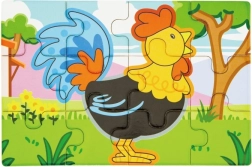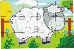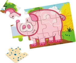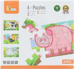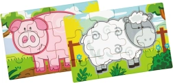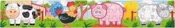 Holzpuzzle mit Bauernhofmotiven. Die Packung enthält insgesamt 4 Bilder (insgesamt 48 Teile). Aus den Puzzleteilen kann ein langes Bild mit allen 4 Tieren zusammengesetzt werden. Verpackungsmaße ca. 20,5 × 19,5 × 4,5 cm. Alter 24m+.