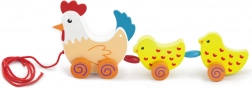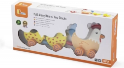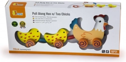 Dieses hölzerne Nachziehspielzeug verbindet die Henne und zwei Küken mit einer roten Schnur. Zwischen den Küken befinden sich bunte Perlen, die beim Bewegen den Seh- und Hörsinn des Kindes ansprechen. Beim Ziehen wippt die fröhliche „Familie“ entzückend und motiviert Kinder zum Laufen.