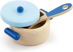 Stilvolles Küchenset aus Holz in Blau für kleine Köchinnen und Köche ab 24 Monaten. Enthält einen Topf mit Deckel, eine Pfanne mit Ei, einen Topflappen und weiteres Zubehör für ein realistisches Kochspiel. Hochwertiges Holz, glatte Kanten und eine sichere Verarbeitung fördern Kreativität, Feinmotorik und Rollenspiel-Spaß.