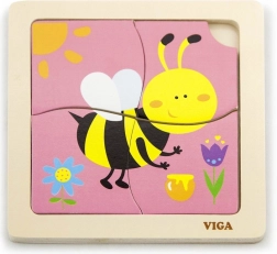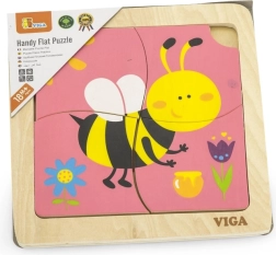 Das Puzzle enthält 4 Teile mit Bienenmotiv, die auf der Grundplatte zu einem Bild zusammengesetzt werden.