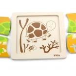 Das Holzpuzzle mit einem Schildkrötchen ist für Kinder ab 18 Monaten konzipiert. Es besteht aus vier großen Teilen, die leicht in den Holzrahmen passen oder separat zusammengesetzt werden können. Jedes Teil ist farbenfroh und bietet eine einzigartige Möglichkeit, die räumliche Vorstellungskraft und Hand-Auge-Koordination zu fördern.