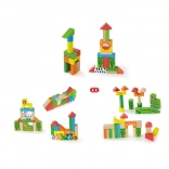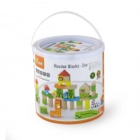 Buntes Set aus Holzbausteinen mit Zoo-Motiven für Kinder ab 2 Jahren. Im Eimer finden Sie 50 Teile und eine bebilderte Broschüre mit Bauanleitungen in drei Schwierigkeitsstufen. Fördert Kreativität, Feinmotorik und räumliches Vorstellungsvermögen – zudem praktische Eimerverpackung für einfaches Verstauen.