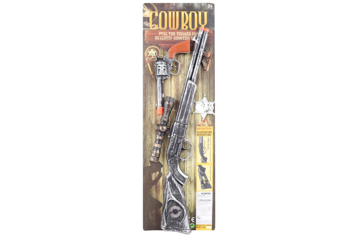 Dieses unterhaltsame Cowboy-Set bietet Kindern ein authentisches Spielerlebnis rund um den Wilden Westen. Das große Gewehr mit einer Länge von ca. 50 cm ist mit einem Visier ausgestattet, die Pistole liegt bequem in der Hand und dank des Schussgeräusch-Effekts wirkt das Spiel noch realistischer – und das alles ganz ohne Batterien.