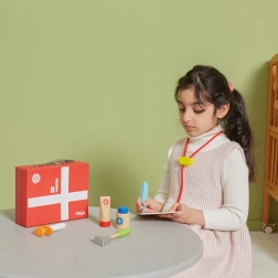Dieses wunderschöne Arztset in einem robusten Holzkoffer begeistert alle kleinen Doktorinnen und Doktoren. Kinder können mit dem Stethoskop das Herz abhören, mit dem Thermometer die Temperatur „messen“, eine Spritze geben oder eine Patientenkarte für Kuscheltiere und Puppen ausfüllen. Das Doktorspiel ist eine unterhaltsame Rollenspiel-Aktivität, die soziale Fähigkeiten sowie Feinfühligkeit und Empathie fördert.
