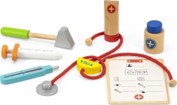 • Inhalt des Sets: Stethoskop, Thermometer, Spritze, Reflexhammer, Salbentube, Patientenkarte, Sirup, Holz-Arztkoffer