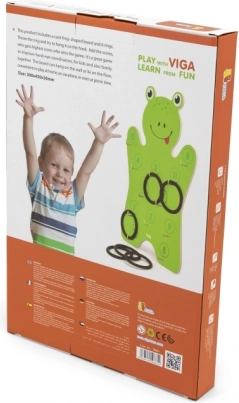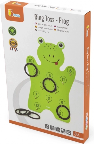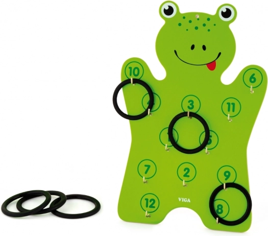 Enthalten sind eine Frosch-förmige Holzplatte und 6 Ringe – einfach auspacken und loswerfen.