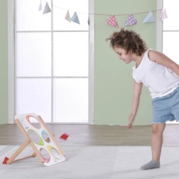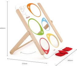 Das Spiel enthält einen Ständer mit Holzrahmen und drei Bohnenbeutel, die dank der klappbaren Konstruktion leicht transportiert werden können.