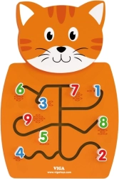 Holzkatze mit Labyrinthen zum Bewegen von Zahlen und zur Förderung der Feinmotorik.