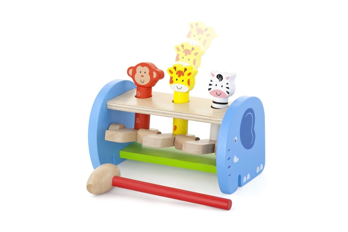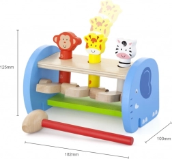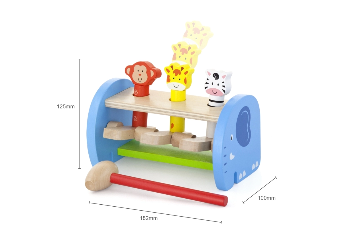 Dieses hochwertige Holzspielzeug bietet sicheres und farbenfrohes Spielen mit niedlichen Tieren. Kinder klopfen mit dem Hammer auf den Mechanismus, der die Tiere herausspringen lässt – so verbessern sie Griff, Greifkraft und Präzision der Bewegungen. Die stabile Konstruktion und glatten Kanten sorgen für Sicherheit bei täglicher Nutzung.