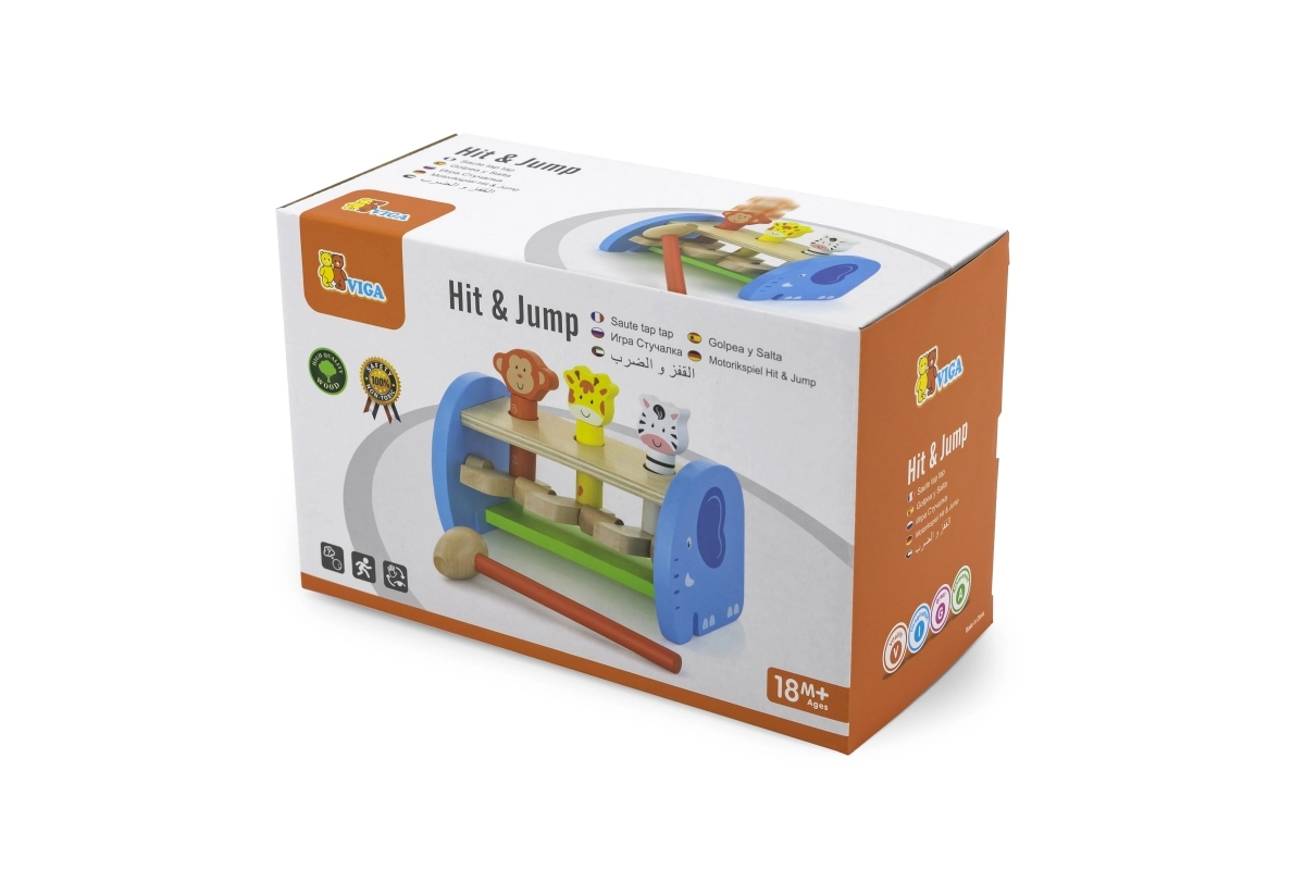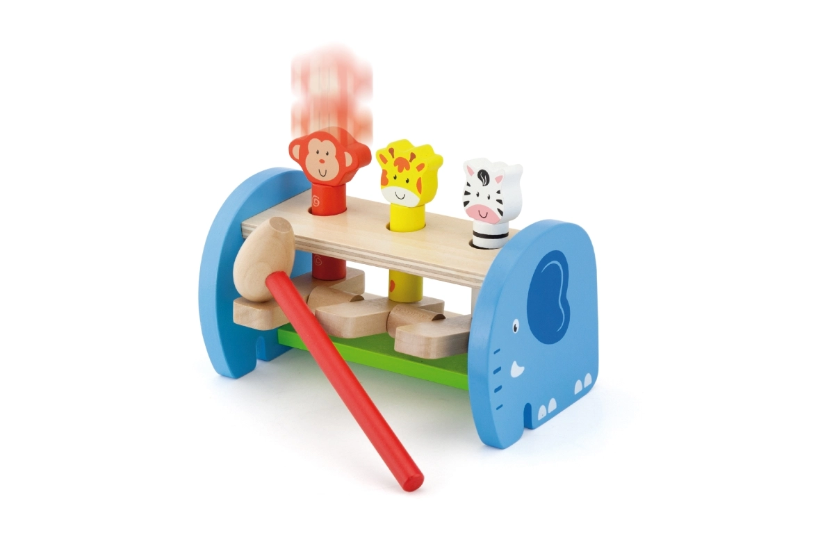Nach einem Schlag mit dem Hammer springen die Tiere hoch – Kinder sehen sofort das Ergebnis ihrer Bewegung und wiederholen es gerne. Ideal, um Aufmerksamkeit und Treffsicherheit zu trainieren.