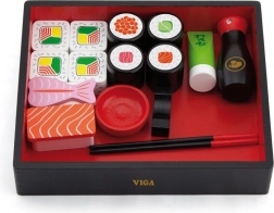 Das Set enthält verschiedene hölzerne Sushi-Stücke, Essstäbchen, einen Behälter für Sojasauce und ein Serviertablett, die ein authentisches Sushi-Serviererlebnis nachbilden. Es ist eine großartige Möglichkeit, Kinder mit verschiedenen Speisenarten vertraut zu machen und ihnen grundlegende Fähigkeiten der japanischen Küche beizubringen.