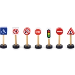 Das Set aus sieben Holz-Verkehrszeichen bietet Kindern grundlegende Kenntnisse über Verkehrsregeln.