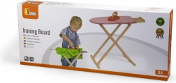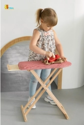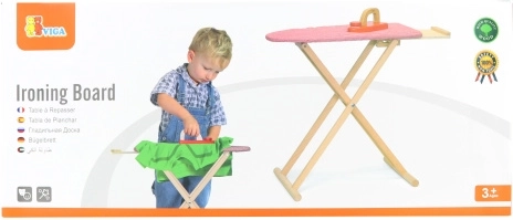 Stilvolles und robustes Holz-Bügelbrett mit Bügeleisen von VIGA für Kinder ab 3 Jahren. Bietet eine klappbare Konstruktion, einen festen Stoffbezug und eine praktische Ablage für Zubehör. Ideal für Rollenspiele und die Förderung der Feinmotorik. Maße des Brettes ca. 61 × 51 × 30 cm.