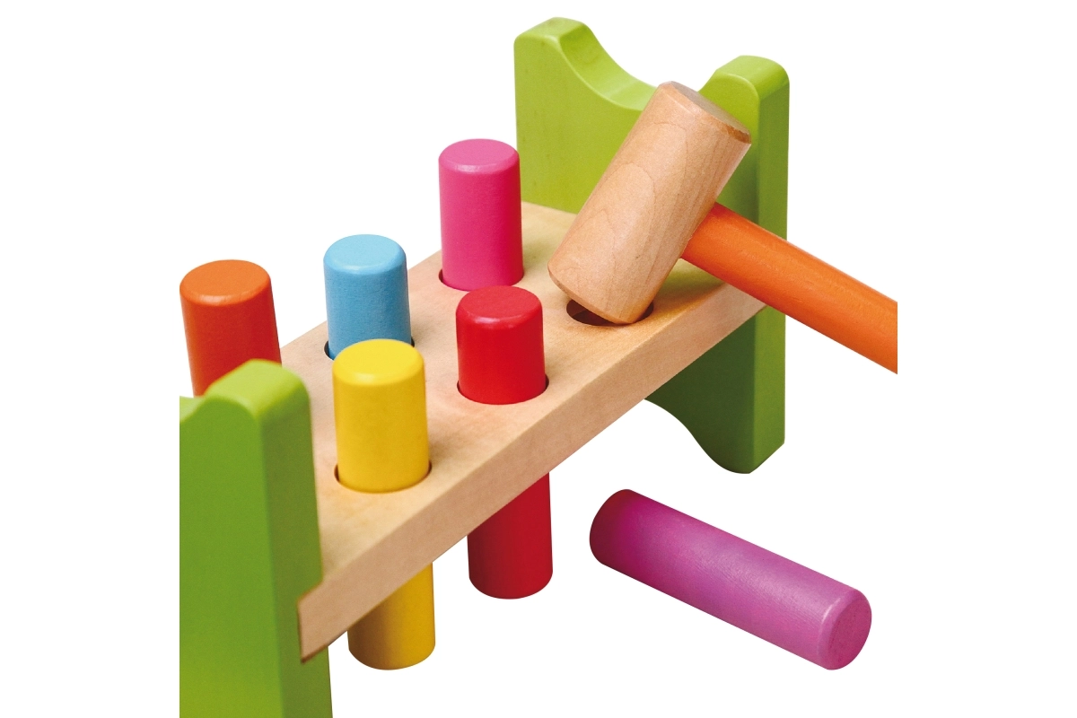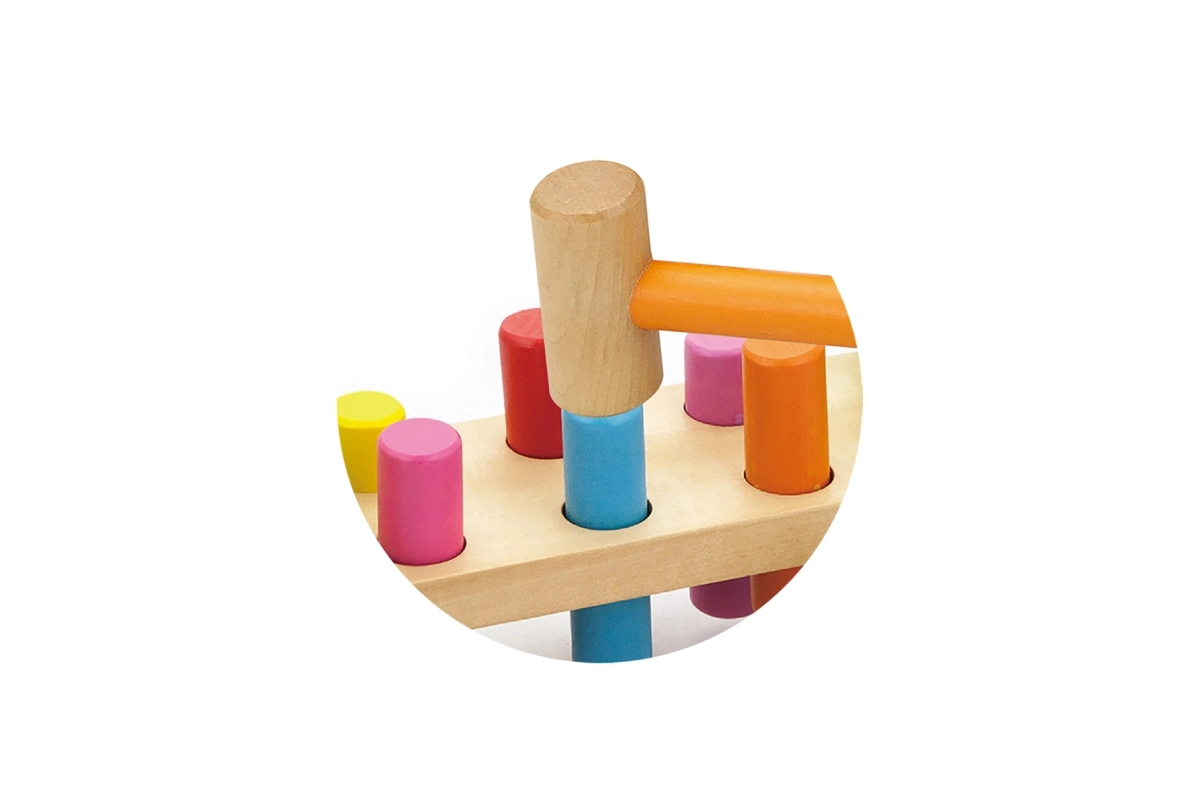 Das Einschlagen der farbigen Stifte trainiert Griff, Präzision und Hand-Auge-Koordination.