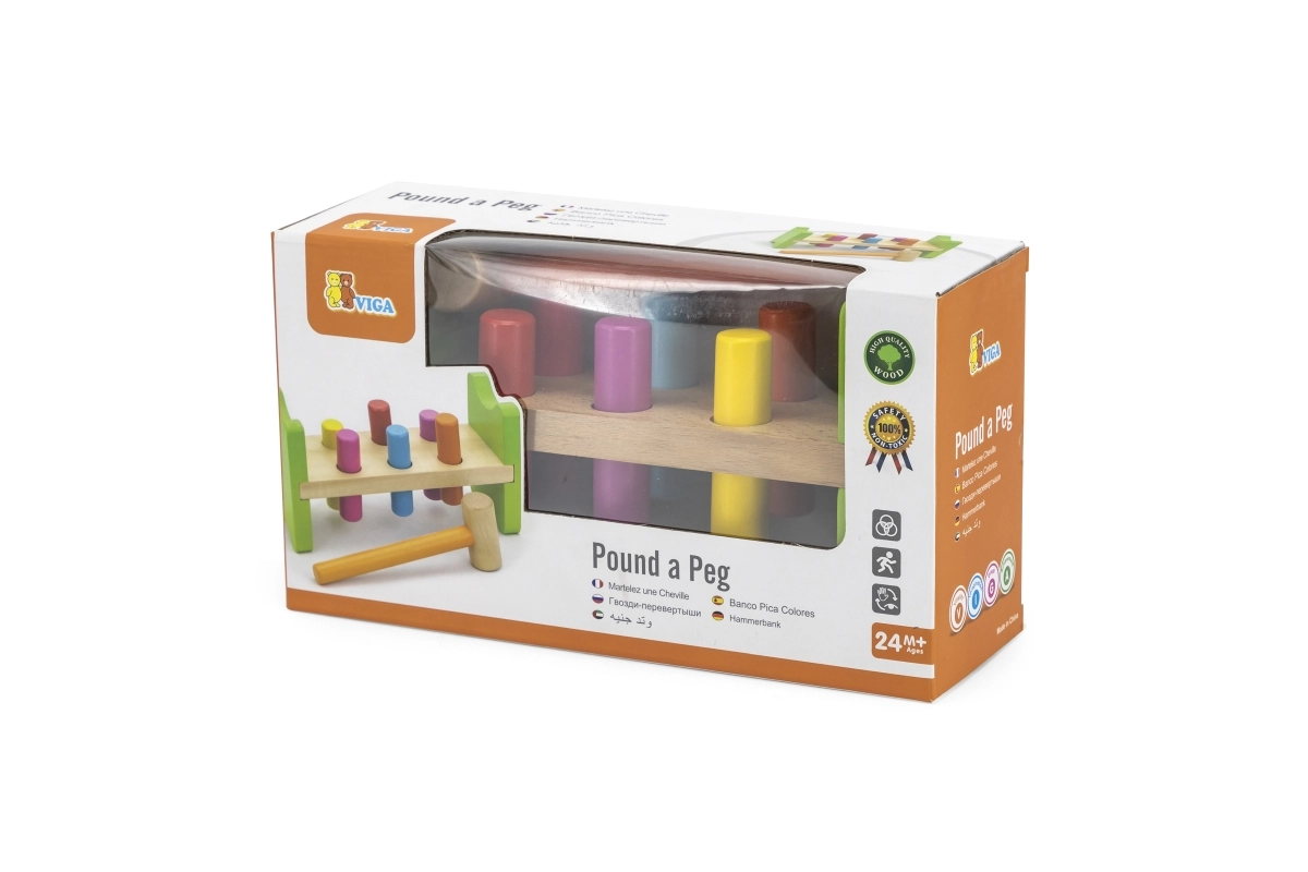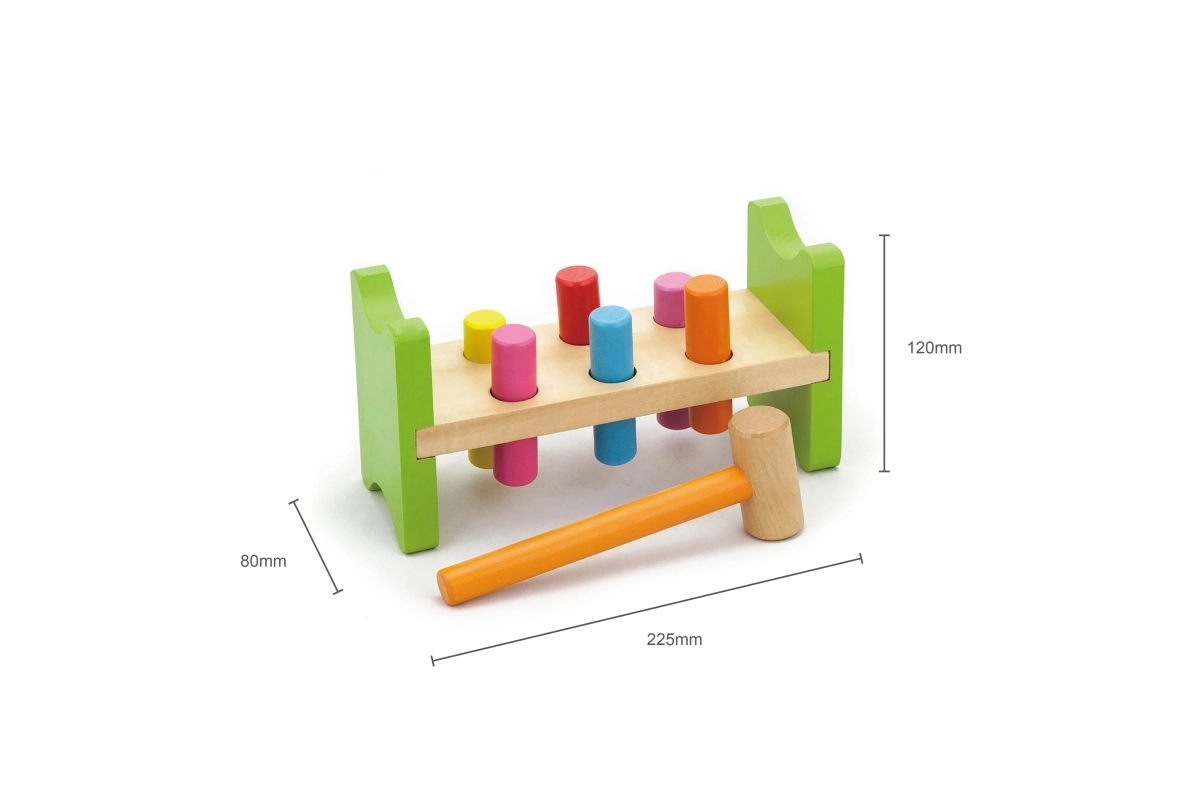 Diese Holz-Klopfbank mit den Maßen ca. 22,5 × 12 × 7,7 cm bietet Kindern stundenlange, sinnvolle Unterhaltung. Die farbigen Stifte werden mit dem Holzhammer eingeschlagen, wodurch Kinder auf natürliche Weise ihre Greifkraft, die Bewegungsgenauigkeit und das logische Denken entwickeln. Die robuste Konstruktion und glatten Oberflächen sorgen für eine sichere Anwendung.