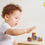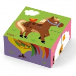 Vier Holzwürfel ermöglichen das Zusammensetzen von bis zu sechs verschiedenen Motiven mit Bauernhoftieren – leuchtende Farben und klare Formen fesseln Kinder sofort.