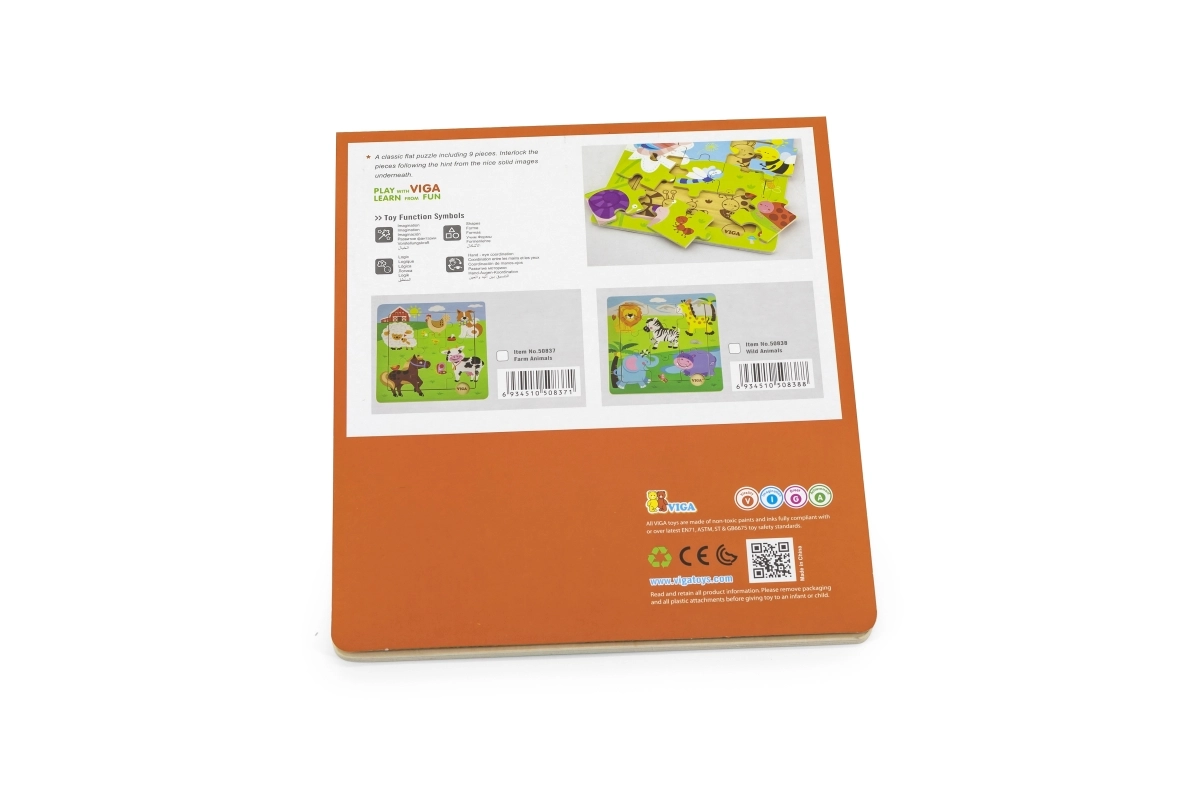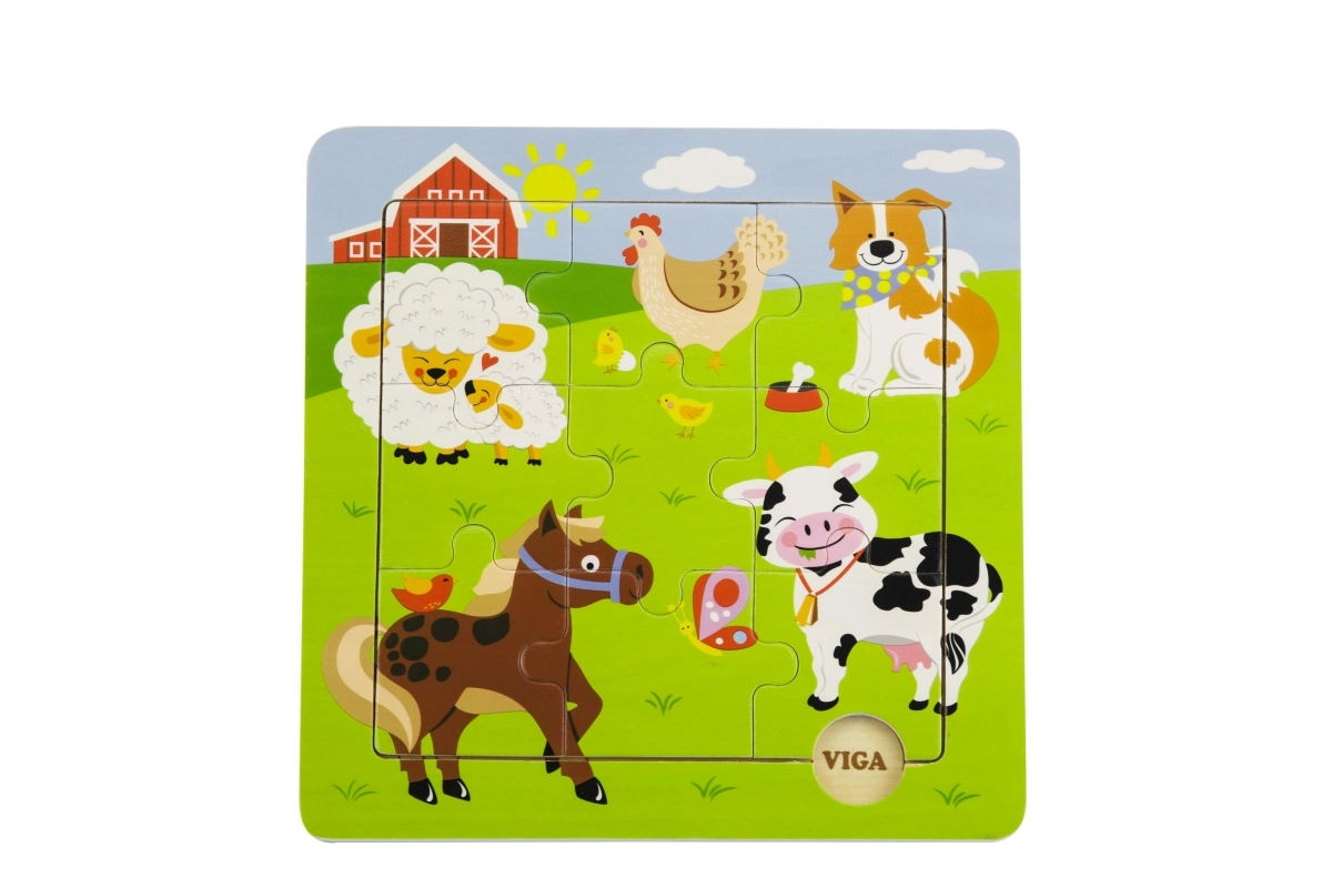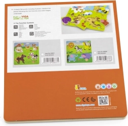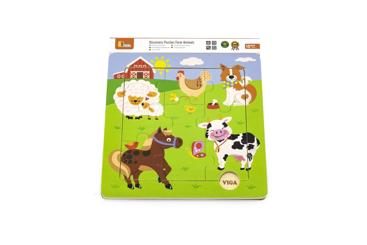 Die Größe des zusammengesetzten Bildes beträgt ca. 22,5 × 22,5 cm – eine praktische Größe für das Spielen am Tisch oder auf dem Boden. Das Puzzle ist geeignet für Kinder ab 18 Monaten und hilft, den Wortschatz beim Benennen der Tiere zu erweitern.