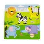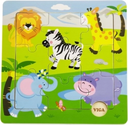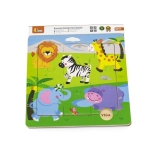 Dieses Holzpuzzle mit Safarimotiv bereitet Kindern Freude am Zusammensetzen und unterstützt gleichzeitig ihre natürliche Entwicklung. Große, leicht greifbare Teile sind auf kleine Kinderhände zugeschnitten und helfen, Konzentration sowie das Erkennen von Formen und Tieren zu trainieren.