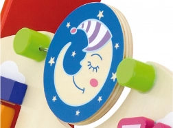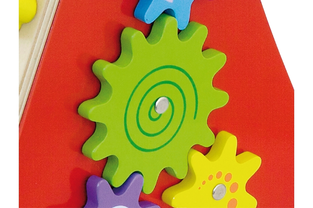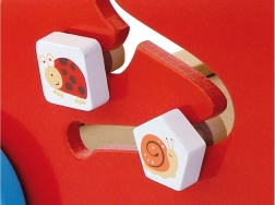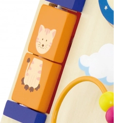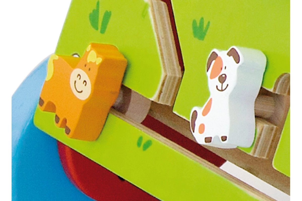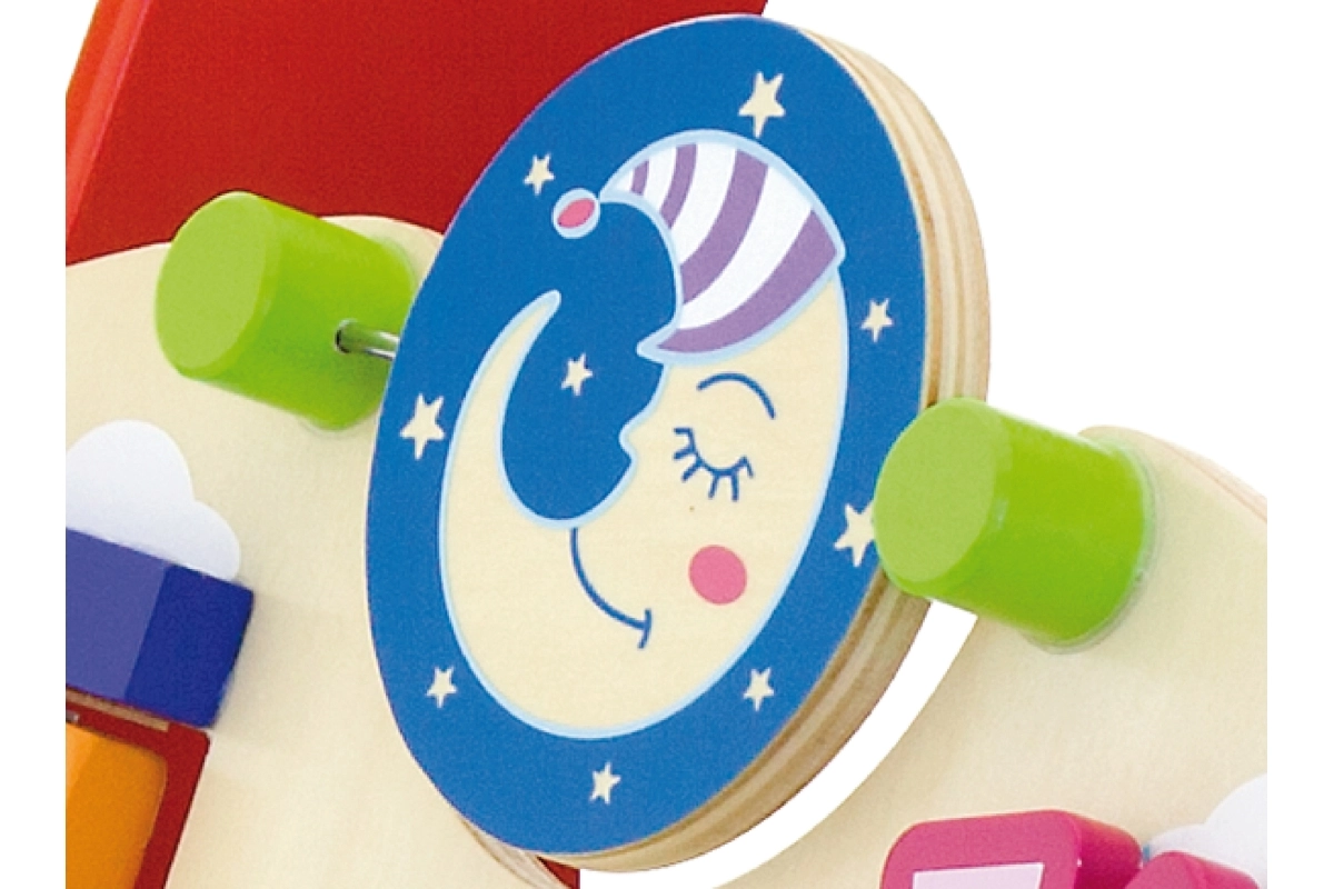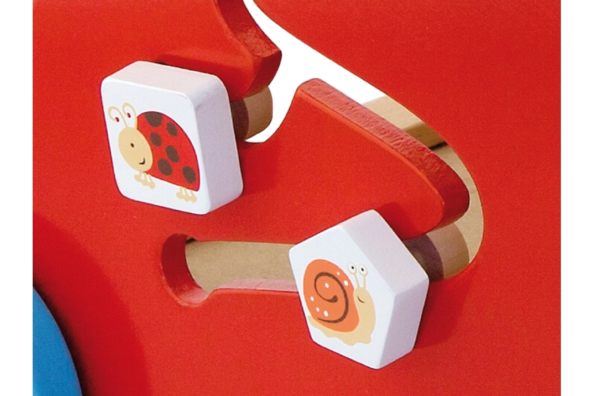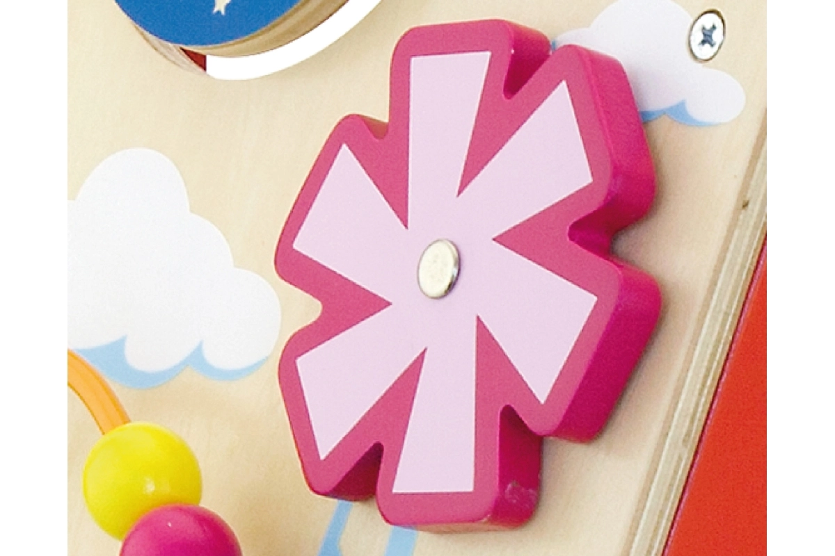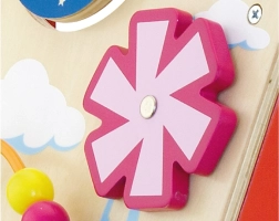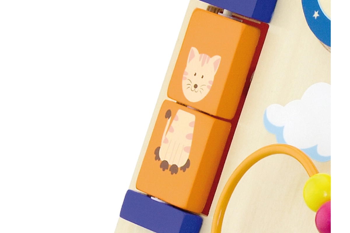 Drehbare Elemente, verschiebbare Tierchen, eine Perlen-Schleife und ein Windrädchen fördern Feinmotorik, Geduld sowie das Verständnis von Ursache und Wirkung.
