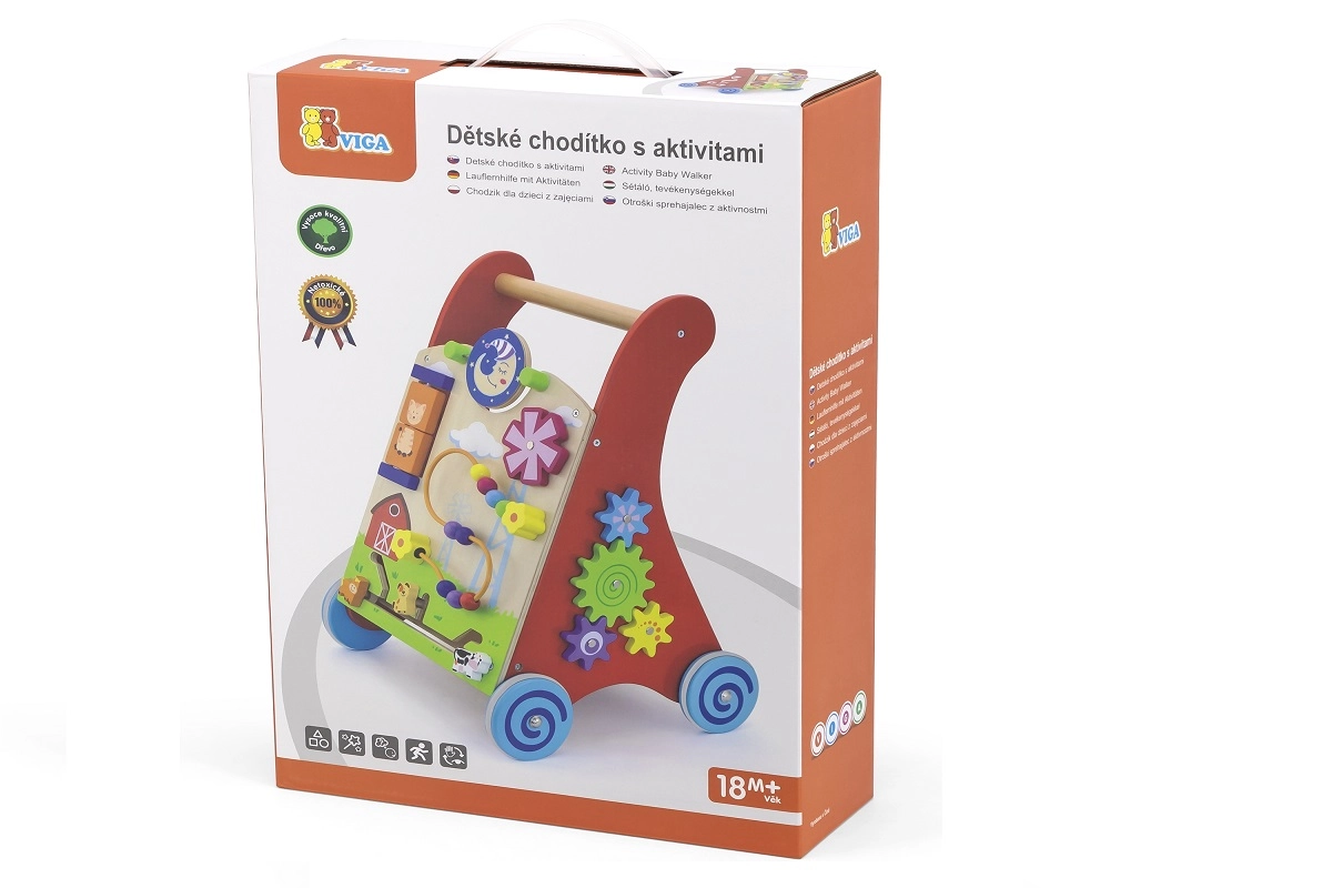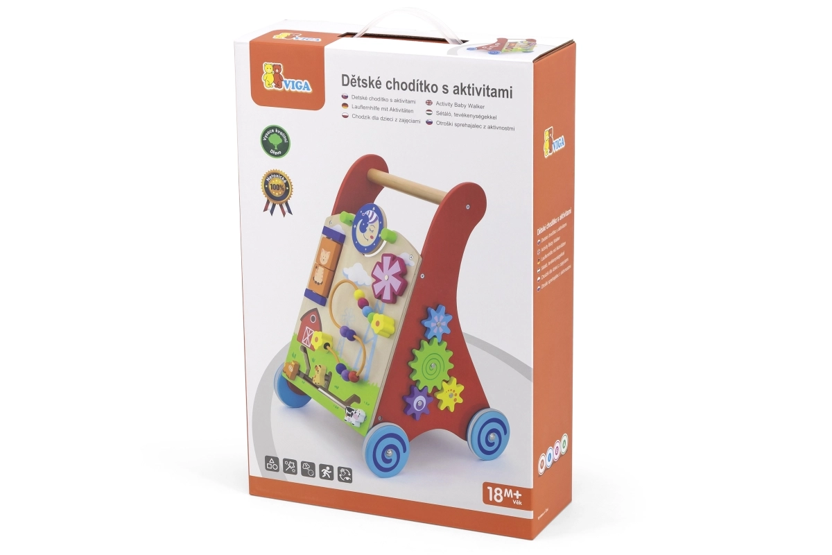 Der hölzerne Lauflernwagen mit Aktivitätentafel der Marke Viga unterstützt Kinder ab 18 Monaten bei ihren ersten Schritten und fördert zugleich die Feinmotorik, die Hand-Auge-Koordination sowie das Erkennen von Formen und Farben. Eine stabile Konstruktion mit gummierten Rädern, sichere Farben und vielfältige interaktive Elemente sorgen für spielerisches und sicheres Lernen.