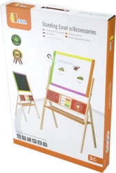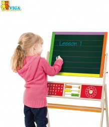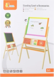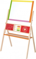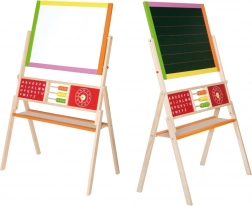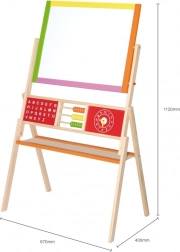 Diese vielseitige Holztafel ist dank ihrer vielfältigen Funktionen ideal für Kinder ab drei Jahren. Sie bietet eine magnetische Fläche für drucklose Marker und eine Kreidetafel für traditionelles Schreiben und Zeichnen. Die Tafel enthält auch unterhaltsame und lehrreiche Elemente: