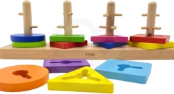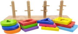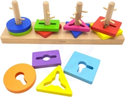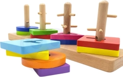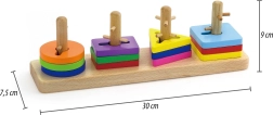 Durch das Zusammenstellen verschiedener Formen auf Holzstiften unterstützt das Spielzeug die Entwicklung der Feinmotorik und der Hand-Auge-Koordination.