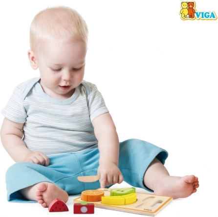 Dieses hochwertige Holzset bietet sicheres Kochspiel: Die einzelnen Obststücke sind mit Klettverschluss verbunden, sodass Kinder sie immer wieder „schneiden“ und neu zusammensetzen können. Durch die realistische Ausführung lernen Kinder Formen und Farben kennen, trainieren den Griff und die Koordination und entwickeln ihre Fantasie beim Rollenspiel in der Küche.
