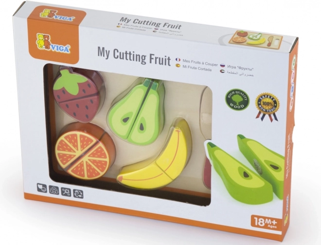 Das Set enthält ein Schneidebrett, ein Holzmesser und verschiedenes buntes Obst, das perfekt in Kinderhände passt. Die robuste Holzausführung und glatt geschliffene Kanten sorgen für Langlebigkeit und sicheres Spielen.