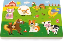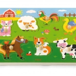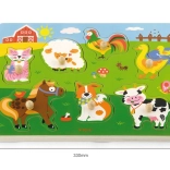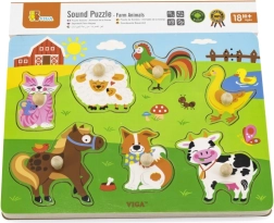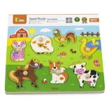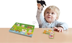 Holzpuzzle mit Tieren und Sound. Beim Einsetzen des richtigen Tieres ertönt das entsprechende Tiergeräusch. Größe der Platte ca. 30 × 22,5 × 2 cm. Stromversorgung 2 × AAA-Batterien (nicht enthalten). Verpackungsmaße ca. 30 × 27 × 2 cm. Alter 18 Monate+