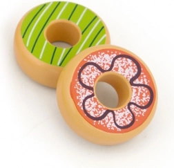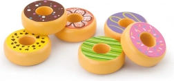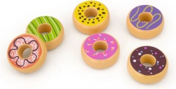 Verspieltes Set aus sechs Holz-Donuts für Kinder ab 18 Monaten, fördert die Feinmotorik, die Fantasie und das Spiel im Laden oder Café. Jeder Donut hat ein anderes farbiges Design und eine angenehm glatte Oberfläche für sicheres Greifen.